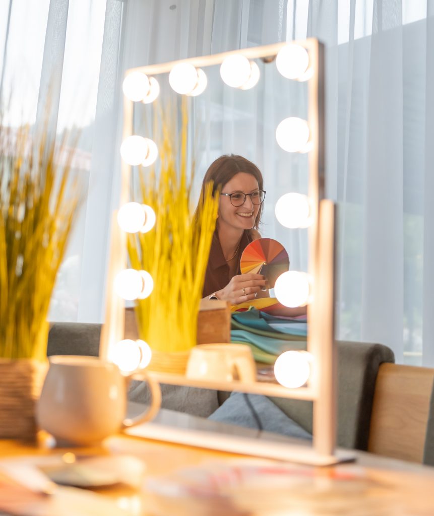 Ich arbeite mit dem modernen 12-Farbtypen-Modell und zeige dir, wie du mit den richtigen Farben frischer, lebendiger und einfach WOW aussiehst – und das alles gemütlich von deinem Sofa aus.